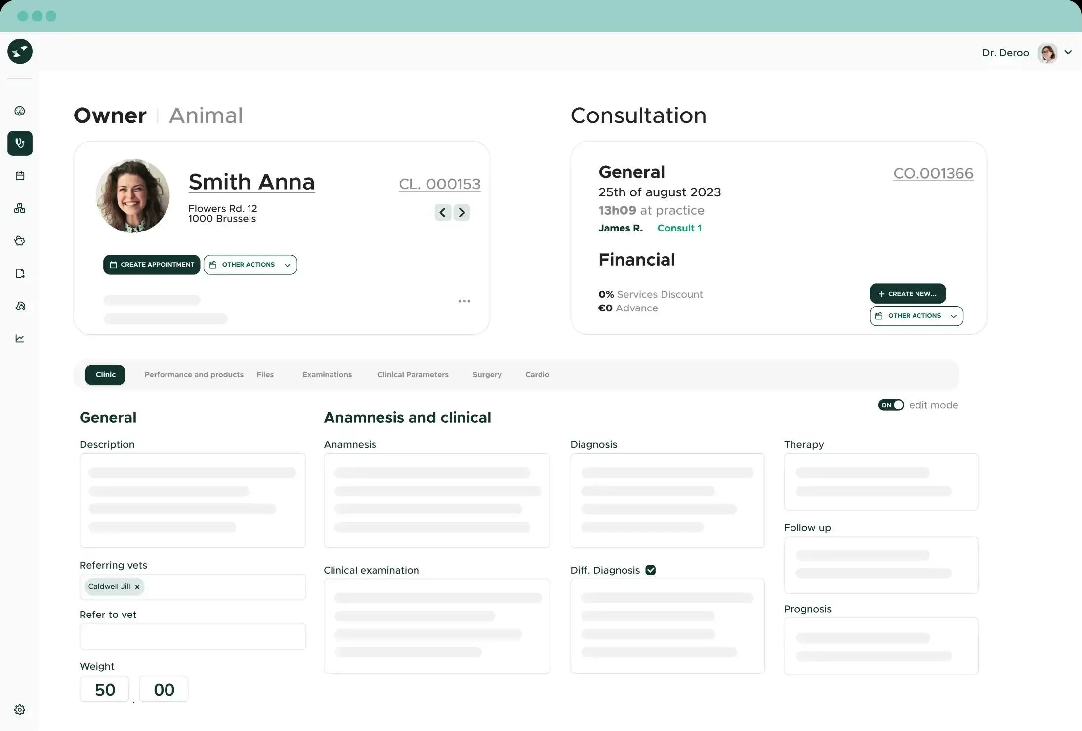 A consultation can be enhanced with clinical record options such as anesthesia, surgery, dermatology, ophthalmology, cardiology, dentistry, etc.